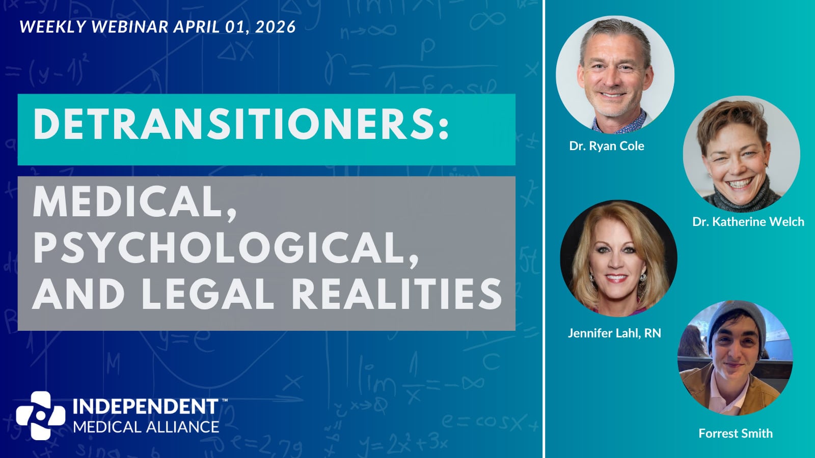 This week’s IMA Weekly Show brought together three people working on different sides of the same problem. Dr. Katherine Welch is an IMA Senior Fellow in Pediatrics and a clinician with the Resilience Health Network, where she provides medical care for patients navigating life after gender-related interventions. Jennifer Lahl is a pediatric critical care nurse and founder of the Center for Bioethics and Culture Network, who has spent years documenting detransitioners’ stories through film and research. And Forrest Smith is a detransitioner who spent roughly six years in medical transition before detransitioning in 2021 and now serves as an ambassador for the Resilience Health Network.