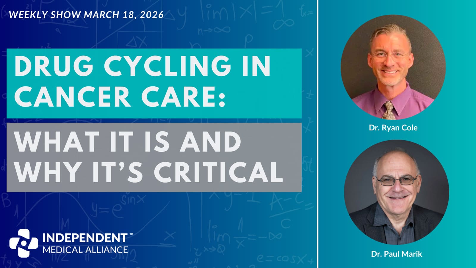 This week, host Dr. Ryan Cole, IMA Head of Medical & Scientific Affairs, is joined by Dr. Paul Marik, IMA Chief Scientific Officer, for a timely conversation on the role of drug cycling in cancer care and why it may be essential to improving outcomes for patients.