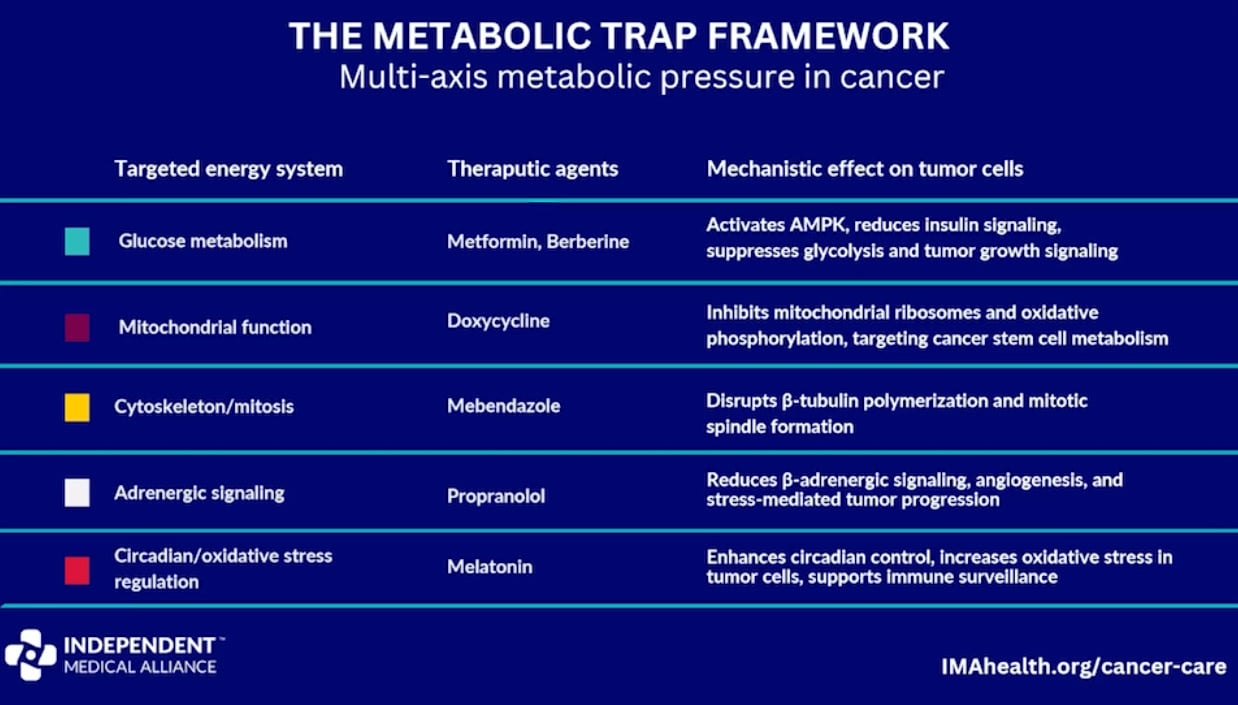 From that insight, Dr. Marik developed what he calls Multi-Axis Metabolic Pressure. The concept is to simultaneously block five metabolic pathways in the cancer cell so it has no remaining source of energy.