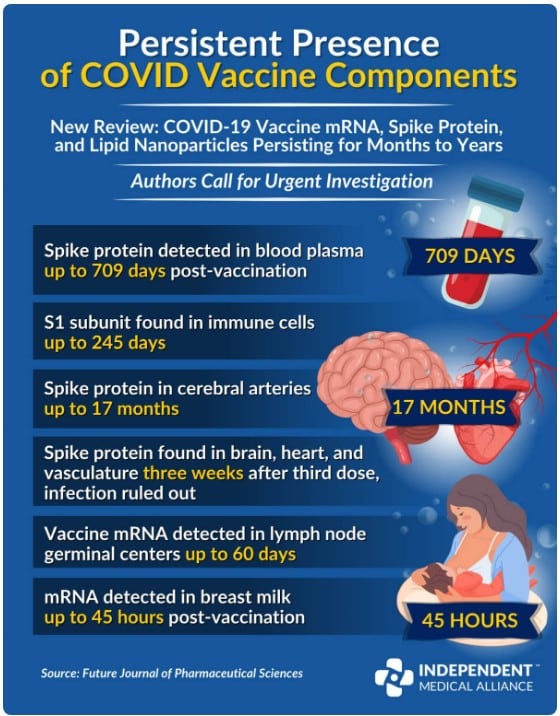 Until now, a new systematic review of 20 studies documents COVID-19 vaccine mRNA, spike protein, and lipid nanoparticles persisting in blood and tissues for months to years.
