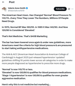 The AHA & ACC (American Heart Association & American College of Cardiology) in August 2025 just released hypertension ‘updated’ guidelines shifting 10 points lower across all categories in order to make more people diagnosed as hypertensive to prescribe more drugs.