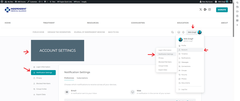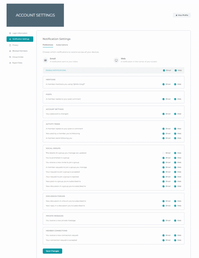 Sometimes you may want to selectively turn off certain types of notifications from the forums. For example you may want to turn off notifications every time some replies to a discussion that you subscribed to. You can do this by clicking on your profile image, rolling your mouse over the Accounts menu, and then clicking on the Notifications Settings menu. This will take you to a screen where you can manage notifications settings.