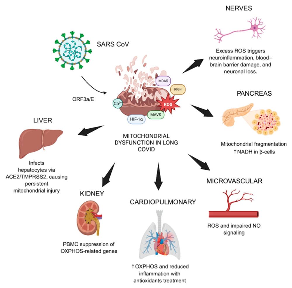 Figure 3: From the study, “This diagram illustrates how mitochondrial dysfunction contributes to long COVID by affecting multiple organ systems. In the kidney, suppression of OXPHOS genes during acute COVID predicts worse outcomes months later. In the pancreas, infected β-cells show mitochondrial fragmentation and metabolic stress, similar to what is seen in type 2 diabetes. In the heart and lungs, antioxidant treatments that target mitochondria improve energy production, reduce inflammation, and improve survival in animal models. In the blood vessels, excess mitochondrial ROS impairs nitric oxide signaling, leading to poor circulation and symptoms like dizziness and post-exertional fatigue. Together, these findings show that mitochondrial damage plays a central role in long COVID symptoms.”