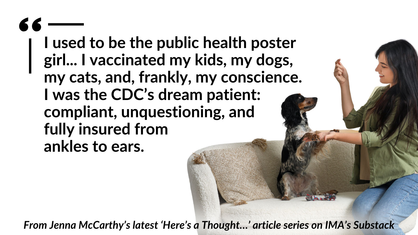 In the latest 'Here's a Thought,' Jenna McCarthy looks back at children's vaccines, "I didn’t set out to become an anti-vaxxer. For a while I didn’t even realize I was one. I actually hate it that I’ve lost all faith in the industries and agencies I once relied on to protect me and my family."